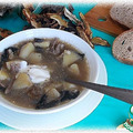 Замочим наши грибы. Если грибы сушеные этого года, то они быстро размочатся, хватит пары часов. А если пересушенные, то замочить на ночь. После замачивания воду слить, крупные грибы порезать, мелкие так оставить. После того, как мясо закипело, снимаем пену и добавляем подготовленные грибы.
