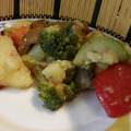 Сначала хочу сказать несколько слов о составе блюда. Каждый раз, когда я его готовлю, состав овощей бывает разным - то, что есть в холодильнике или под рукой. Можно добавлять капусту, стручковую фасоль, убирать грибы или другие овощи. Летом, когда овощи дешевые, проблем вообще нет. А вот для зимнего варианта, который я сегодня хочу показать, я специально замораживаю порезанные полукольцами кабачки и баклажаны, нарезанные дольками помидоры и крупными квадратами болгарский перец. Обязательными ингредиентами являются картофель, кабачок или баклажан, болгарский перец, чеснок, морковь и желательно помидор. Цветную капусту, грибы и брокколи обычно покупаю в заморозке. Картофель порезать тонкими кусочками, сложить в глубокую миску, добавить соль и немного растительного масла. Я обычно беру подсолнечное и добавляю немного оливкового. Выкладываем картофель на противень так, чтобы каждый кусочек лежал отдельно. В эту же миску выкладываем кабачки, солим по вкусу, добавляем растительное масло. Кабачки выкладываем на противень к картофелю. С баклажанами поступаем так же, как и с кабачками: солим по вкусу, добавляем растительное масло. И выкладываем на противень. Чеснок режем пластинами. Раскладываем сверху картофеля, кабачков и баклажанов. Оставшиеся овощи солим, добавляем растительное масло и перемешиваем в миске. Выкладываем на противень сверху.