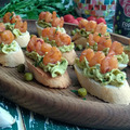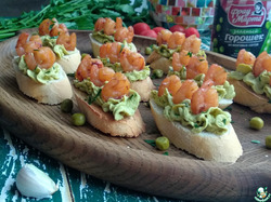 В сковороде на оливковом масле (2 ст. л.) обжарить нарезанную одну дольку чеснока, добавить креветки, соевый соус и обжарить до золотистости. В блендер поместить консервированный горошек. Добавить фету, одну дольку чеснока и 1 ст. л. оливкового масла. Измельчить до однородной массы. Можно использовать погружной блендер. Багет нарезать на кусочки, подрумянить их в тостере. Сверху намазать измельчённой фетой с горошком, для этого я использовала кондитерский мешок. Поверх распределить креветки. Готовые брускетты подаём к столу.