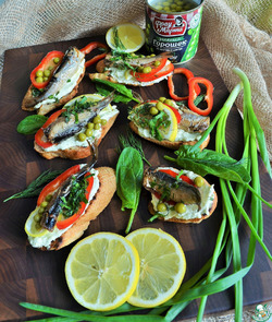 Нарезать багет и подсушить ломтики, в тостере, на сковороде или в духовке. Смешать погружным блендером сыр, 40 г. зелёного горошка и майонез. Намазать на ломтики багета сырно-гороховую массу, нарезать тонкие колечки лимона, красного перца, вымытую и обсушенную зелень шпината и укропа. Положить по шпроте, украсить лимоном, колечком перца, зеленью и горошком. Как вариант вместо багета взять крекер или несладкое печенье.