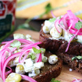 Всё готово, остаётся приготовить сами бутерброды. Для этого на кусочки поджаренного хлеба положить огуречный салат, а сверху положить отжатый от уксуса лук. Бутерброды "Три огурца" готовы. Приятного аппетита!