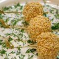 Приготовить соус. Для этого развести мед в 5 столовых ложках соевого соуса и 1 ст. ложке гранатового соуса. Если мед твердый — можно слегка нагреть в микроволновке. Тефтельки наколоть на шпажки, обмакнуть полностью в соусе и обвалять в кунжуте. В процессе поедания рекомендую макать в тот же соус. Наслаждайтесь!