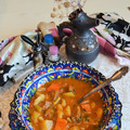 Добавить молотый кориандр и паприку. Перемешать. Обжарить 3 минуты, постоянно перемешивая, чтобы паприка не подгорела. Влить томаты в собственном соку, 1 л кипятка, перемешать и тушить 20 минут. Посолить. Томаты можно заменить свежими помидорами или томатным соусом. Картофель почистить и нарезать кусками по размеру мяса. Выложить в казан. Тушить на среднем огне. Перец и сельдерей нарезать. Выложить в казан, тушить 20 минут. Долить еще кипятка, покрывая овощи.