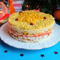Куриную грудку мелко нарезать, распределить в сервировочном кольце. Смазать 1-2 ст. л. майонеза. Мандарины почистить, нарезать кусочками, распределить поверх куриного мяса. Вареные яйца почистить, отделить белок от желтка. Белок натереть на крупной тёрке поверх мандаринов. Смазать 1 ст. л. майонеза. Отварную морковку натереть на крупной тёрке поверх яичного белка. Смазать 1 ст. л. майонеза. Сверху распределить кукурузу. Натереть сыр на мелкой тёрке поверх кукурузы. Смазать 1-2 ст. л. майонеза. Сверху натереть желток на мелкой тёрке. Перед подачей снять сервировочное кольцо, украсить по желанию.