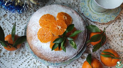 Выложить в форму, у меня диаметром 18 см. Выпекать при температуре 180 градусов до готовности. Сварить сироп из воды и сахара, выложить кружочки очищенных мандарин, проварить минуты 2, оставить остывать в сиропе. Готовый кекс украсить мандаринами и сахарной пудрой.