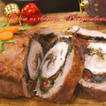 Мы подавали горячим, поэтому рулет немного раскрылся, когда его нарезали, но на вкусе это не отразилось. Холодный рулет легко режется тонкими кусками и не раскрывается. Подавать можно с овощным гарниром или салатами из свежих овощей.