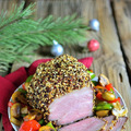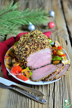 Температура готовности свиной шеи - 85 градусов внутри, можно готовить с термометром для мяса. Но чтобы не протыкать кусок и сохранить красоту, можно обойтись и без него - готовить при 85-95 градусах 15 минут на 1 см диаметра, так гарантированно будет эта температура внутри готового мяса. Готовое мясо завернуть в бумагу или фольгу и охладить в холодильнике не менее 8 часов.