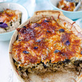 Смазать соусом дно жаропрочной формы для запекания. На него аккуратно выложить мясо. На мясо внахлест выложить баклажаны. Залить соусом, посыпать тертым сыром и поставить в разогретую до 180 градусов духовку до появления румяной корочки, примерно на 25 минут.