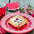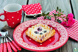 Готовое слоеное тесто разрежьте на 16 прямоугольников или квадратов. Острым ножом разрежьте тесто, на каждом квадрате, но не до конца, внутренний прямоугольник, как показано на фото. Положите 1 или 2 чайные ложки начинки на центр каждого квадрата из слоеного теста. Поместите ягоды смородины, немного их вдавливая в начинку. Я положила 3-4 ягодки. Ориентируйтесь на свой вкус.