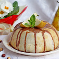 Для подачи в сотейнике подогреть сливки, положить кусочками шоколад и перемешать до однородности. Если соус сильно густой то можно добавить немного сливок. Снять пленку, перевернуть торт на тарелку, украсить грушей и полить шоколадным соусом.