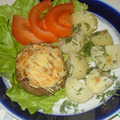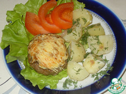 Обжаренные биточки выложить в форму для запекания. В углубления положить начинку, смазать майонезом или сметаной, посыпать сыром и поставить в горячую духовку.