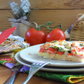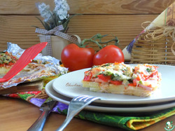 Укладываем все составляющие запеканки слоями произвольно. Я укладывала так: на томаты протёртые-помидор-колбасу-перец болгарский-зелень-сыр. Ставим в духовку опять при т-180 С. У меня запеканка делалась ещё 12-15 минут. Запеканка готова. Вынула запеканку из формы и разрезала на две части-на две порции.