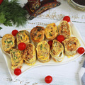 Разложить лаваш (у меня овальной формы). Распределить начинку. Посыпать зеленью. Закатать в рулет. Порезать на маленькие рулетики.