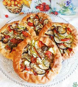 Подготовим овощи. Баклажан и кабачок нарезать тонкими кружками толщиной примерно 2-3 мм. С помидора я снимаю шкурку, обдав его кипятком, ( но это по желанию), нарезаю на кусочки. Кабачок и баклажан лучше брать не толстые. На пергаменте или антипригарном коврике раскатать тонко тесто. Положить тонким слоем фарш, отступая от края примерно 2-3 см. Сверху на фарш положить овощи чередуя их. Подогнуть свободные края теста, защипывая его по кругу. Овощи смазать растительным маслом, посолить и поперчить по вкусу.