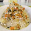 3. На дно формы для выпекания налить растительное масло, выложить половину лука, затем – филе трески, посолить, поперчить;
