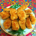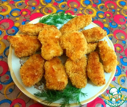 Выложить запанированные кусочки курочки на застеленный пергаментом противень. Выпекать в разогретой до 180 градусов духовке сначала с одной стороны 10 минут, затем перевернуть и ещё 10 минут запекать с другой стороны. Если у вас духовка печет и сверху, и снизу, то переворачивать не нужно.