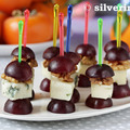 На шпажку нанизать поочерёдно: половинку виноградины, половинку ореха, кубик сыр, половинку виноградины. Орехи прокалывайте медленно и осторожно, так как они могут расколоться на половинки. Хотя даже расколотые орехи прекрасно держатся, зажатые между сыром и виноградом.