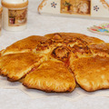 Пирог разделить на 6 кусочков, прорезая между кусками тонкую полоску шириной 1-1,5 см, не затрагивая при этом центр пирога.
