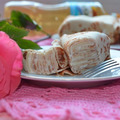 Каждый блинчик промазываем кремом. Десять блинчиков отложить не смазанными. Не надолго убираем промазанные блины в холодильник. Затем разрезаем на 10 равных частей, каждый кусочек оборачиваем оставшимися блинами.