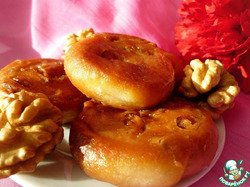 Вынув из духовки, горячие печенья поливаем сахарным сиропом. Подержать в сиропе час-два. Постараться, чтобы в сиропе они были целиком.