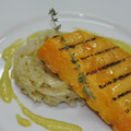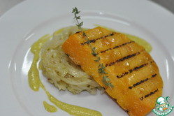 Тыкву нарезать на куски 1-1,5 см ширины. Замариновать: добавить оливковое масло, соль и мускатный орех тертый. Обжарить на гриле, поместить в духовку на 5-7 мин, (я люблю, чтоб внутри было чуть хрустящее).