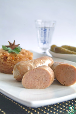 Теперь, если хотите, сформируйте небольшие порционные колбаски, перекручивая череву после каждой. Уложите в пароварку и готовьте при 85* минут 40. Если пароварки нет, положите колбаски в дуршлаг, поставьте на емкость с водой большую по размеру и готовьте тоже минут 40. (Вода ни в коем случае не должна кипеть!) Если у вас есть кухонный термометр - готовность проверить еще проще. Температура внутри изделия должна быть 75* Второй вариант можно приготовить эти колбаски в подсоленной воде. Но в этом случае вода тоже не должна кипеть! Готовятся они в воде при той же температуре (85*) 15-20 минут. Затем так же кратко обжариваются.