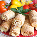 Готовые трубочки снять с противня и выложить на блюдо. Трубочки получаются очень мягкие, нежные, но в тоже время сытные. Прекрасно подойдут для перекуса на природе!