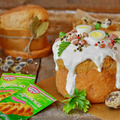 Готовые куличи выньте из форм и полностью остудите. Украшение - на свой вкус. В качестве глазури я использовала смесь рикотты и сметаны. Посыпка из нарезанной кубиками ветчины и перцев горошком. Дополнительно украсила перепелиным яйцом.
