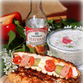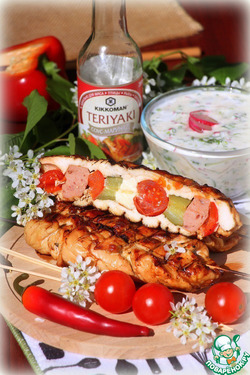 На предварительно замоченные деревянные шпажки нанизать кусочки сардельки, соленого огурца, перца, копченого сыра и черри (начинку можно использовать любую, по своему вкусу). Положить начинку на середину грудки.