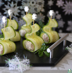 Кладём шарик паштета на полоску огурца. Заворачиваем шарик в полоску, скрепляем шпажкой.