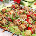 7. Берем куриные кусочки и нанизываем на шпажки вместе с овощами, лук выкладываем на бумажное полотенце, а соус от мяса выливаем. К овощному соусу добавляем 2 ст. л. растительного масла, а лучше оливковое, немного досаливаем и перемешиваем. Этим соусом периодически смазываем (силиконовой кистью) шашлык в духовке.