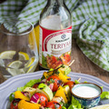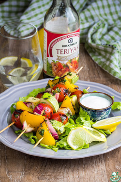 Для заправки смешаем в миске мелкорубленную зелень (у меня петрушка), лимонный сок, оливковое масло, орегано и соус Терияки. Маринуем овощи минимум пол часа. Шпажки смочим в воде и насадим на них промаринованные овощи.