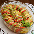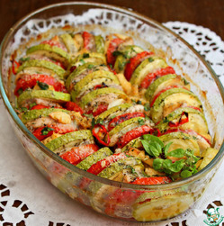 Выпекала в разогретой до 200 градусов духовке 45 минут, выключила духовку, посыпала запеканку тертым сыром и оставила в духовке еще на 10 минут. На дне запеканки образуется достаточное количество сока, полейте им запеканку или, что очень вкусно, разбавьте немного йогурта этим соком, выдавите туда зубчик чеснока и полейте запеканку при подаче.