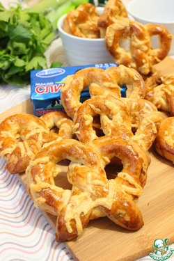 Все крендели укладывают на противень. Смазываю их желтком, посыпают тёртым сыром. Выпекают в разогретой до 180 градусов духовке 15 минут. Последние 2-3 минуты я переключаются духовку в режим верхнего жара, чтобы крендели красиво зарумянились. Главное не пересушить крендели!
