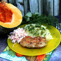 Филе курицы порезать мелкими кусочками. Чтобы котлеты были сочнее, берите не только филе, но и бедрышки. Добавить специи, соль, перец. Тыкву почистить и натереть на крупной терке. Добавить мелко рубленную зелень, йогурт и майонез. Вбить яйцо и добавить крахмал (не принципиально какой). Хлеб замочить в молоке и тоже добавить к фаршу. Все хорошо перемешать.