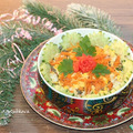8. Выкладываем салат в сервировочное блюдо, украшаем желтком, дольками огурца и маринованной морковью. Приятного аппетита!