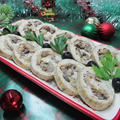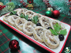 На фарш выложить грибную начинку, не доходя до края 1,5-2 см. Свернуть рулет, закрыть пищевой пленкой, завязать концы, как конфету. Рулет опустить в кастрюлю с кипящей водой. Варить после закипания 15-20 минут. Рулет остудить, снять пленку. Нарезать на ломтики. Выложить на сервировочное блюдо, украсить по желанию. Приятного аппетита!