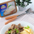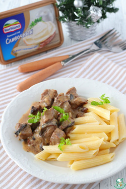 Сковороду снять с огня, добавить 1 ст. ложку сливочного сыра. Сковороду поставить на очень тихий огонь и прогреть соус вместе со сливочным сыром до полного расплавления сыра. Далее блюдо снять с огня. Гарнировать блюдо картофелем фри, пастой, гречневым или рисовым гарниром. Приятного аппетита!