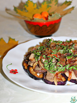 Грибы почистить, помыть, слегка отварить, выложить в дуршлаг, чтобы стекли. На растительном масле обжарить грибы с лавровым листом, посыпать грибным порошком, посолить и поперчить по вкусу, добавить по вкусу колечки чили. Выложить на баклажаны в один слой.