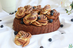 Две части рулета переплетаем. Края хвостиков защипываем друг с другом, в результате чего получаем круглый калач. Остальные калачи делаем по указанной технологии. Выпекать 20-25 минут в разогретой духовке до 185°С.