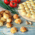 Или можно слитно, в виде пирога. Яйцо взбить вилкой с чесноком, выдавленным через пресс. Смазать булочки, с помощью силиконовой кисточки, посыпать кунжутом. Выпекать в духовке, заранее разогретой до 180 градусов, 10-15 мин. до румяности.