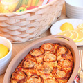 Укладываю их в форму для запекания, слегка вдавливая в сырно-овощную массу (примерно до половины каждой обвернутой тефтели). Таким образом формирую всю запеканку.