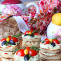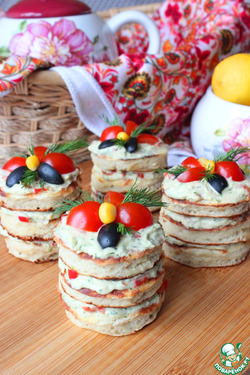 Каждый кружок оладьи смазываю толстым слоем крема, укладываю их друг на друга. Сверху тоже выкладываю крем. Затем украшаю пирожные по желанию. Я украсила дольками помидор черри, кусочками маслин, зеленью и кукурузой. Закусочные фасолевые пирожные из оладий готовы. Приятного аппетита!