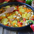 На разогретом подсолнечном масле обжарить мелко нарезанный лук. Добавить нарезанное куриное филе и, постоянно помешивая обжарить на сильном огне. Тыкву почистить и нарезать на кусочки. Произвольно нарезать перцы.