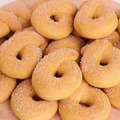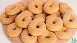 Просеиваем 300 г муки. Вам может потребоваться чуть больше или меньше, зависит от свойств муки, размера яйца. Тесто получается плотное, но не тугое, достаточно мягкое, не липнет к рукам и к столу. Тесто я поделила на кусочки по 25 г каждый, получилось 23 кусочка. Кусочек теста скатываю в ровный шарик, затем раскатываю ровную колбаску. Соединяю края и обмакиваю в сахар.
