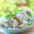 Салат заправляем буквально перед подачей - иначе заправка впитается в картофель и салат будет тяжелым и сухим. Перемешиваем салат и тотчас подаем, украсив петрушкой. Приятного аппетита! По желанию можно присыпать черным молотым перцем.