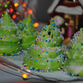 Противень застелить пекарской бумагой. Добавляем краситель до желаемой интенсивности цвета. Наполняем этой массой кондитерский мешок или шприц с обычной круглой насадкой. Сначала выдавить нижний слой елочек. На нижний – средний. И затем – верхний слой. Украсить кондитерской посыпкой и сушить елочки в духовке при 100-110 градусах приблизительно на 1,5-2 часа.