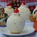 Взбить холодные сливки с ванилином в крепкую пену. Отсадить из кондитерского мешка в центр полусфер взбитые сливки. Положить кусочки вишни. Соединить половинки. Украсить сливками и коктейльной вишней.
