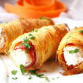 Морковь помыть, почистить и нарезать с помощью овощечистки. Конусные формочки обернуть полоской бекона. Затем обернуть полоской морковки.