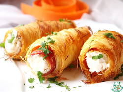 Выпекать в духовке, заранее разогретой до 180С, 15-18 минут, до румяности. После вынуть трубочки из духовки, дать немного остыть и, с помощью кондитерского шприца, наполнить творожным сыром. По желанию трубочки посыпать зеленью и можно подавать к столу.